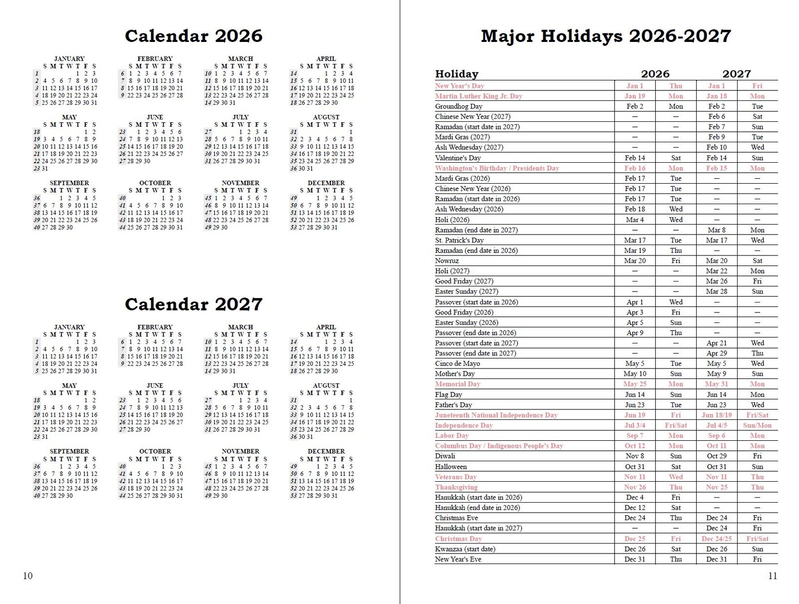 - Includes: Important Dates, Contacts, Calendar 2026–2027, and Major Holidays 2026–2027