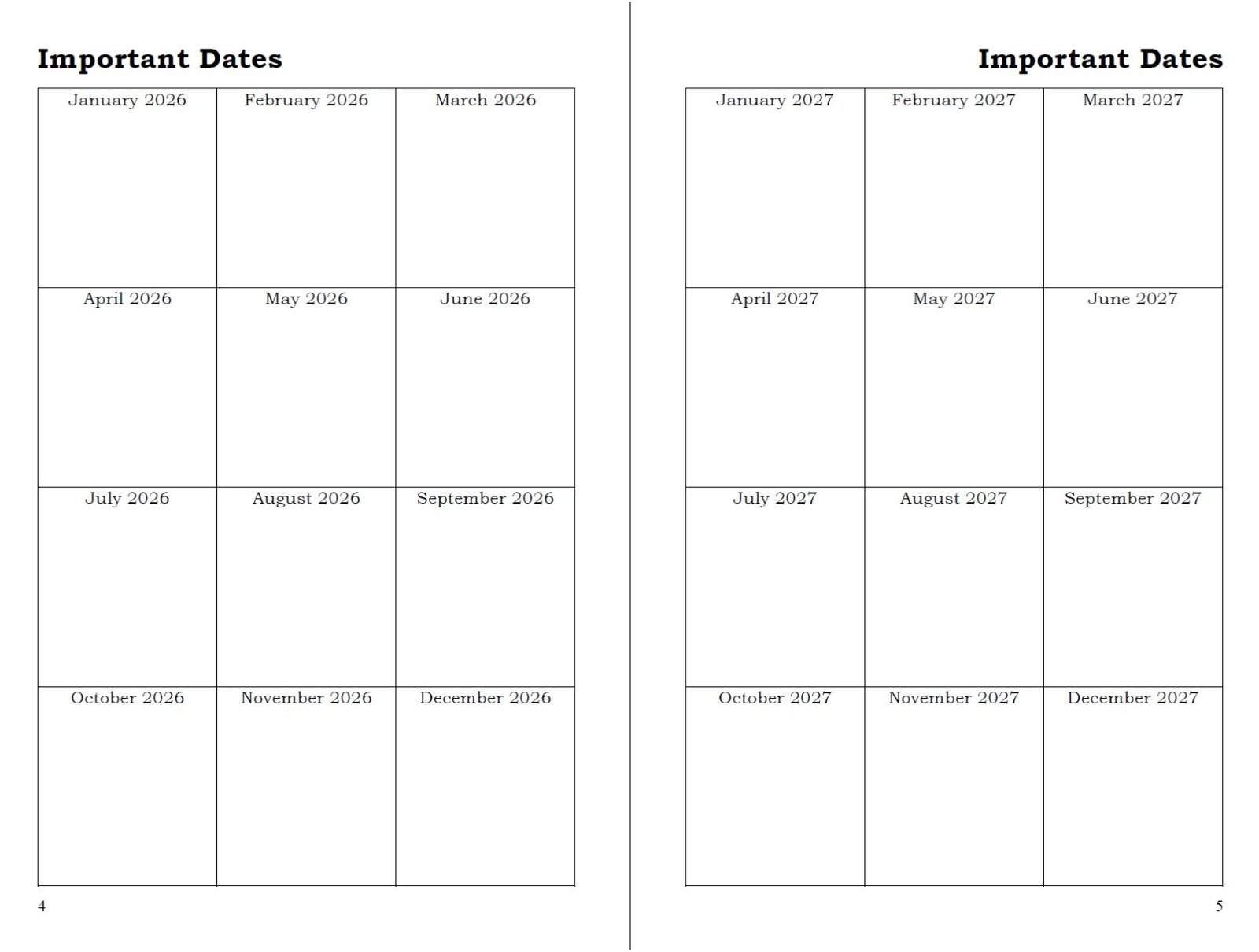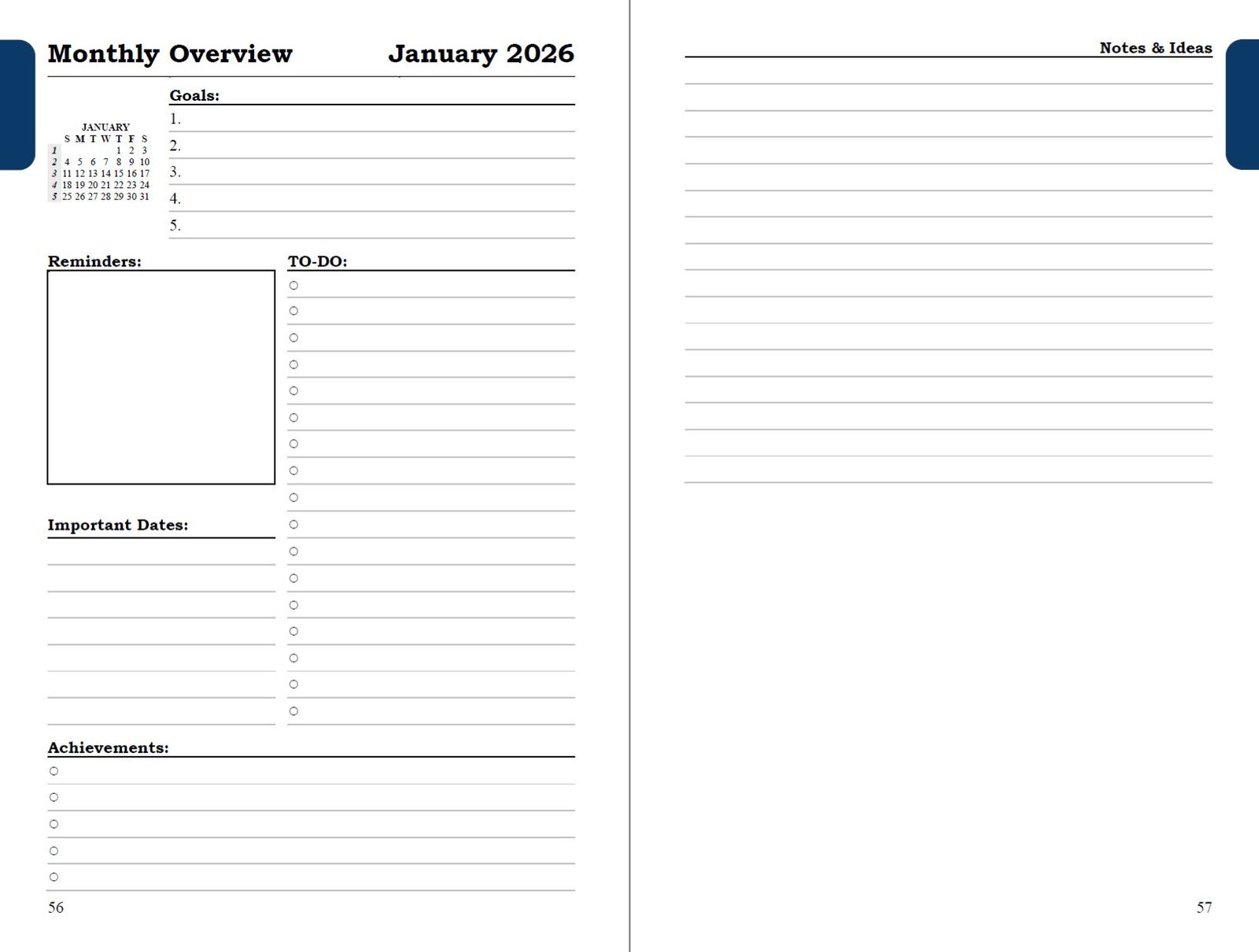 - Spacious unruled daily blocks for flexible planning (pages 7–8)