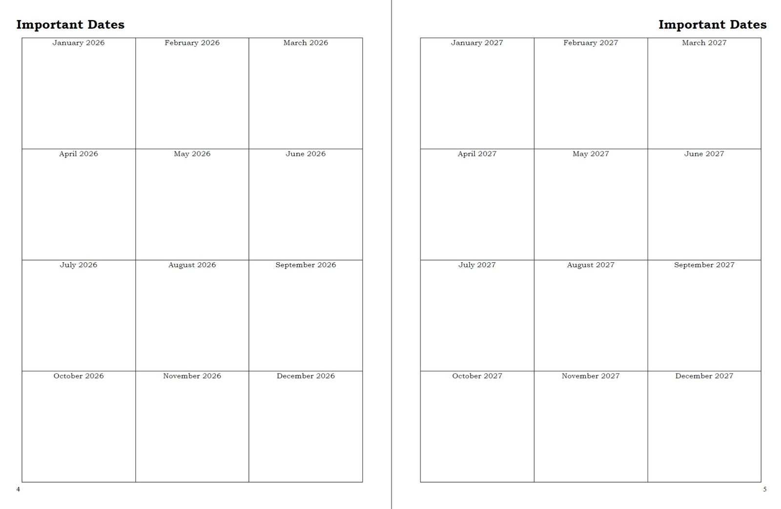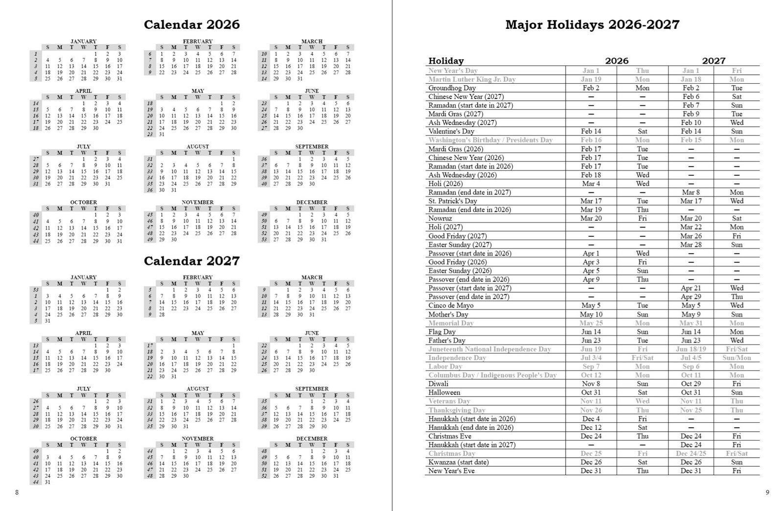 - Includes: Important Dates, Contacts, Calendar 2026–2027, and Major Holidays 2026–2027