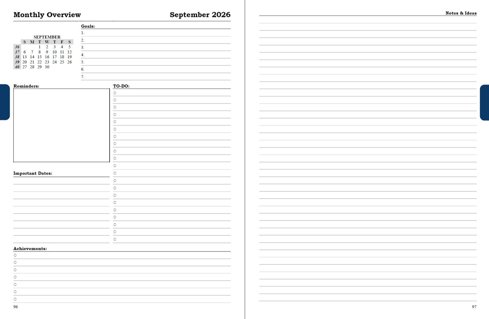 - Spacious unruled daily blocks for flexible planning (pages 5–6)
