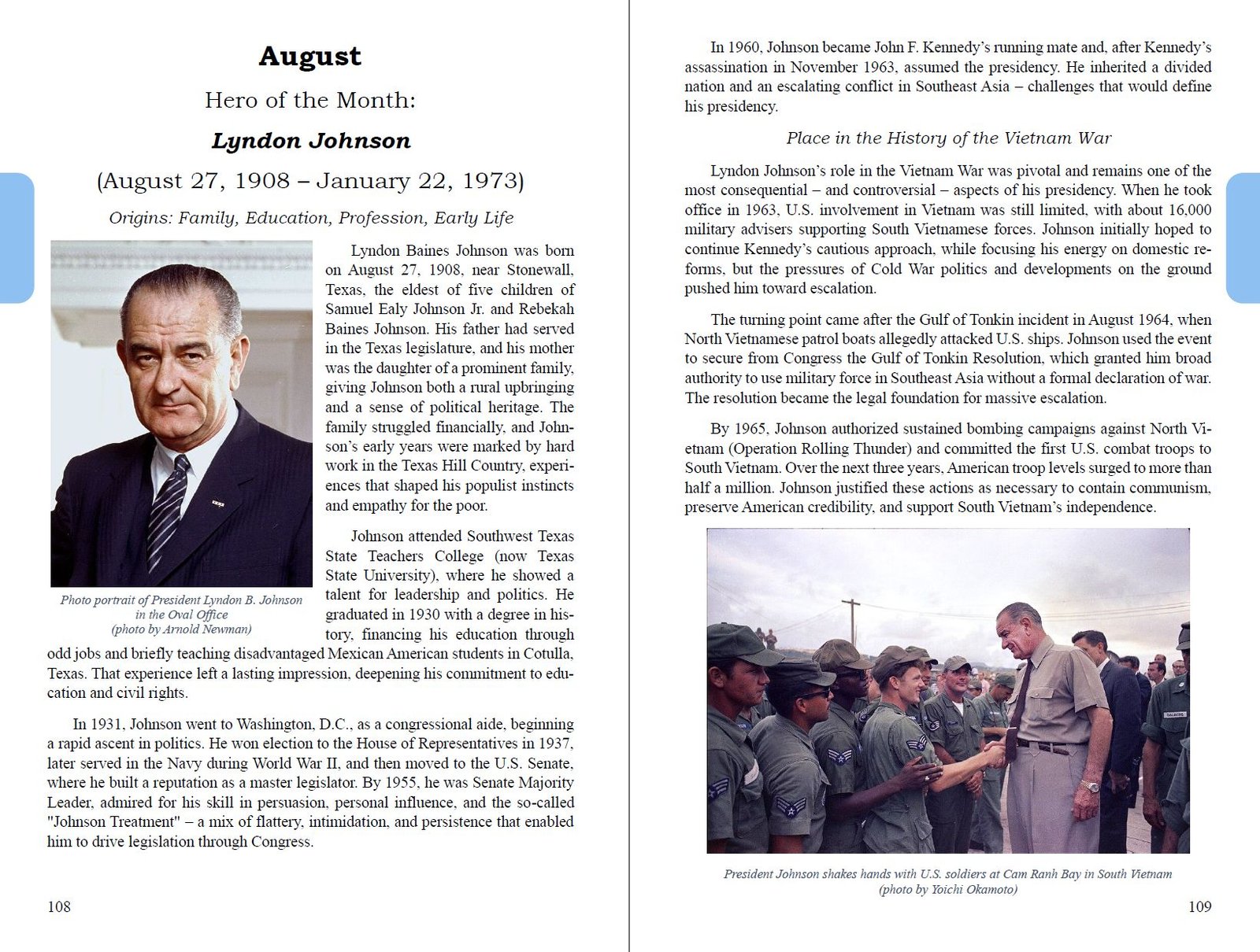 - “Hero of the Month” – biography of a prominent American figure from Vietnam War era born that month (pages 1–3)